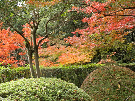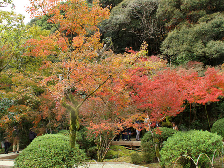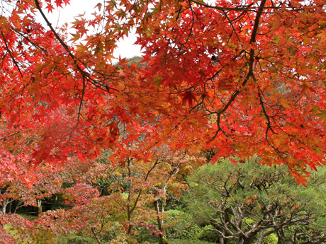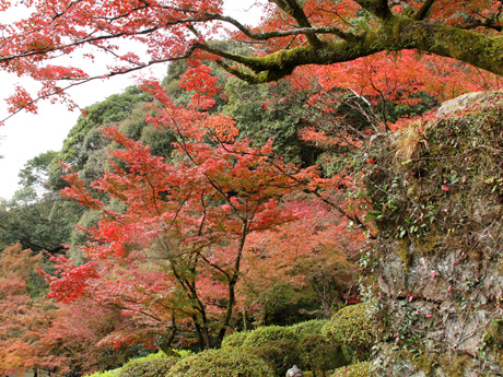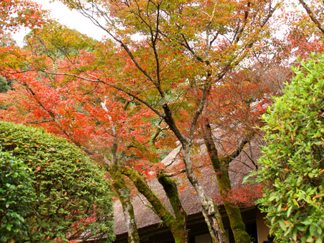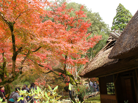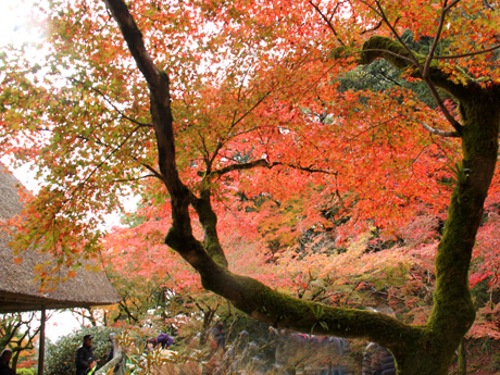 鮮やかな紅葉と苔の緑、茅葺の山荘など鮮やかな