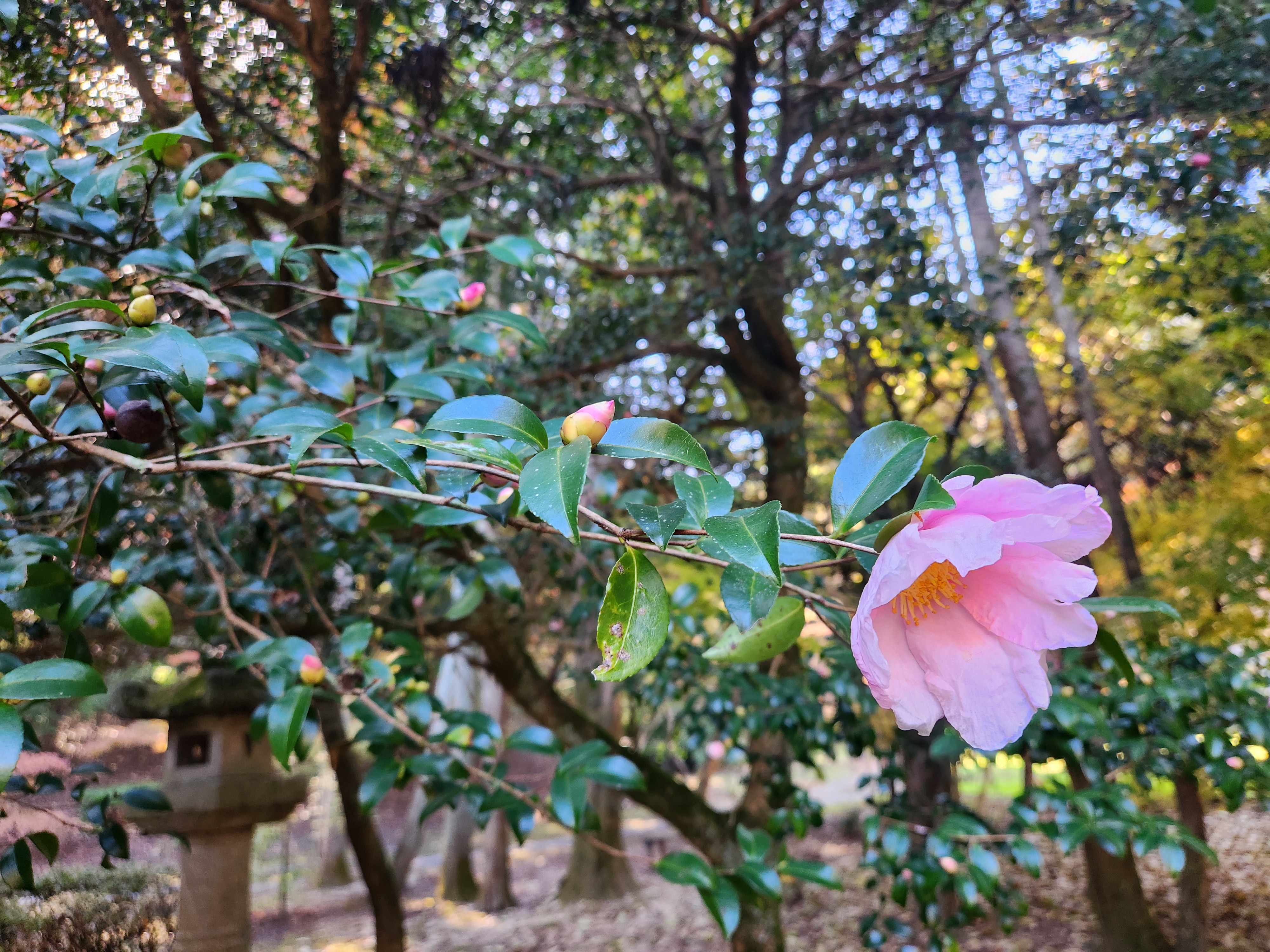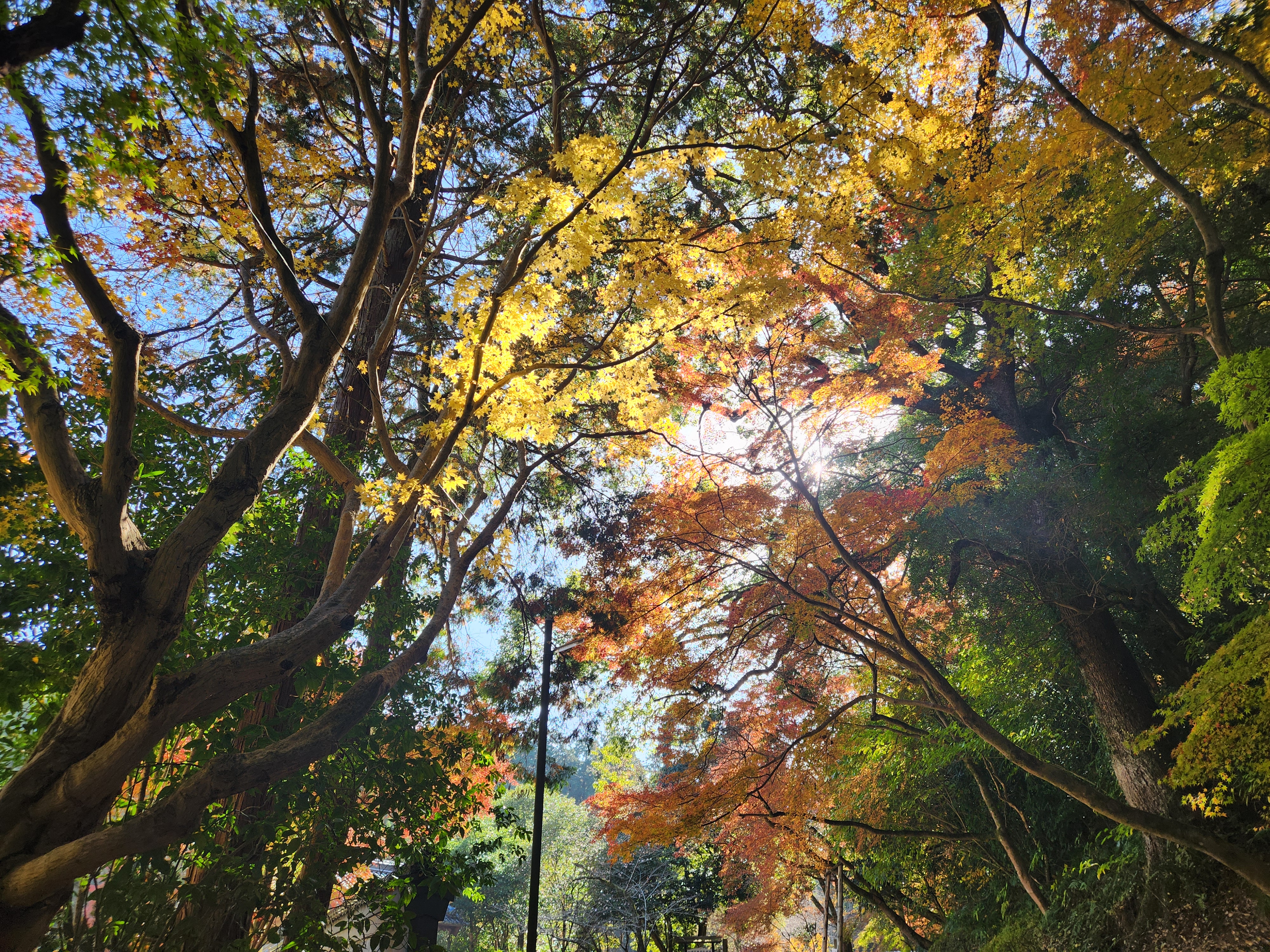 まだ残っている葉はまっ黄色で、隣の楠の大木の青々とした濃い緑の葉っぱとの対比が鮮やかです。強い風でも吹いたら根元は黄色のじゅうたんのようになるでしょう。