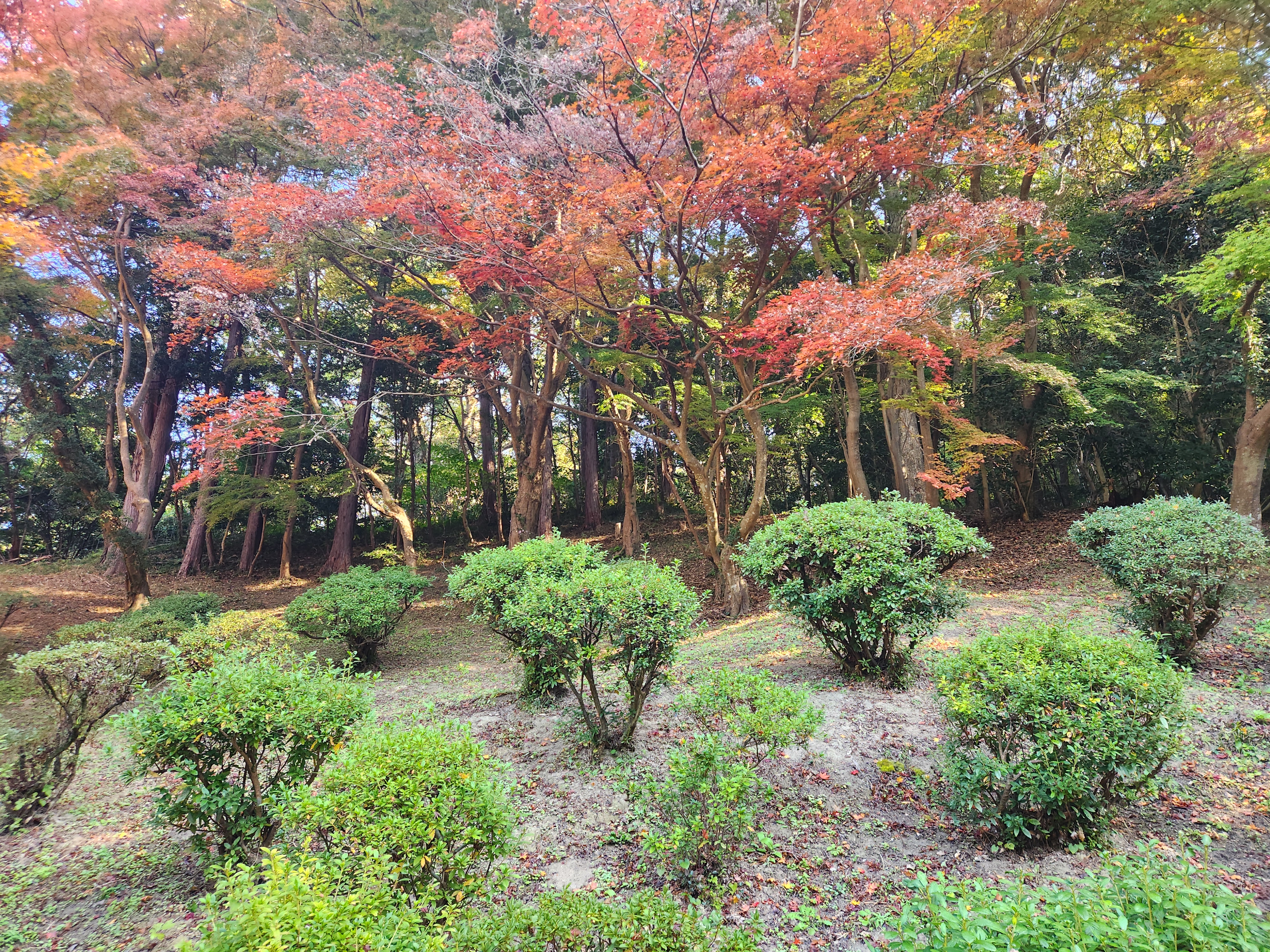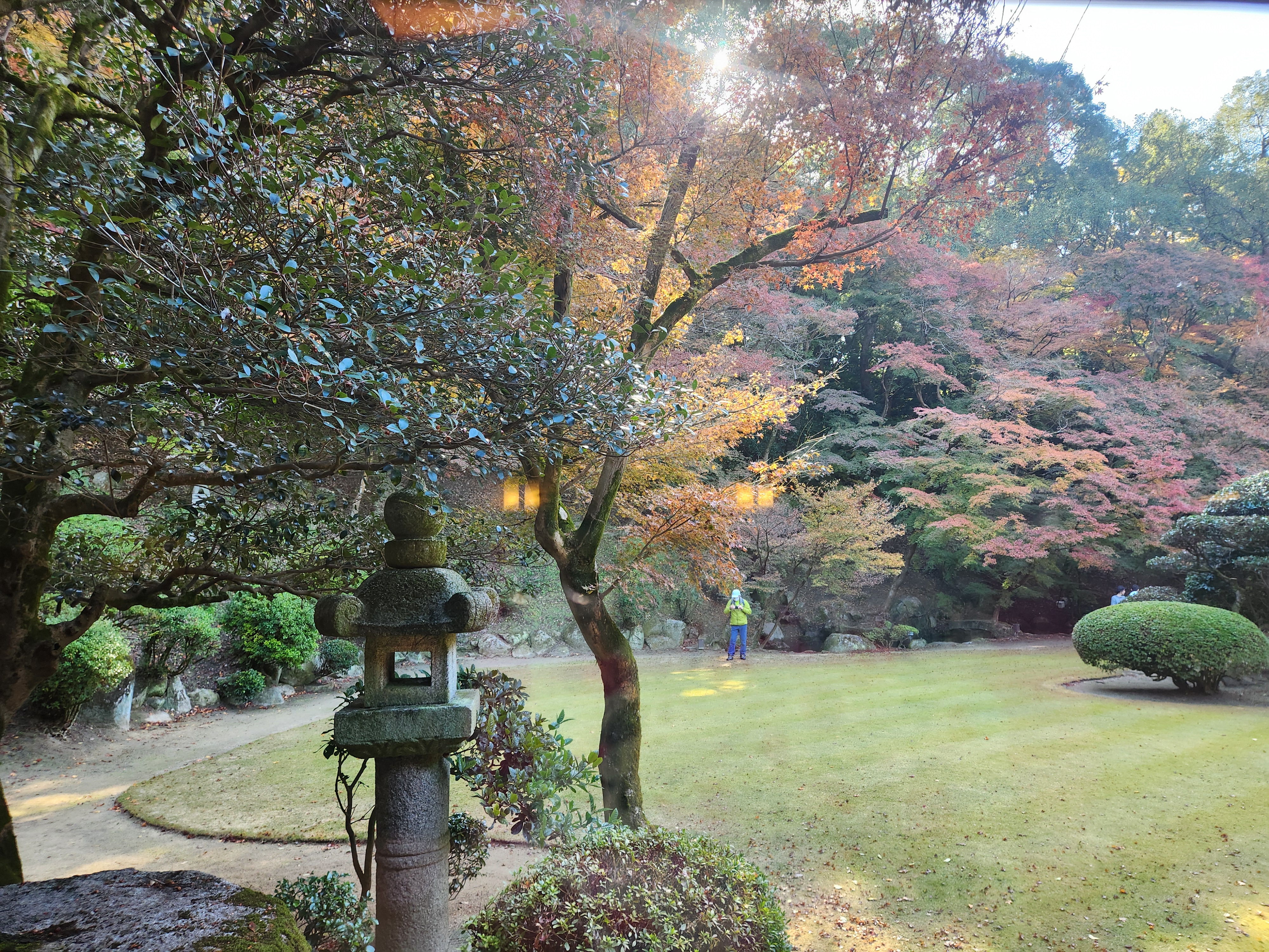 緑の芝生を取り巻く紅葉が山を借景にして池にも美しく映えています。