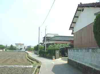 道路右側(東)手前より二軒目の 家は荒尾市、市境は前方(北)の 白い建物当たり。 |